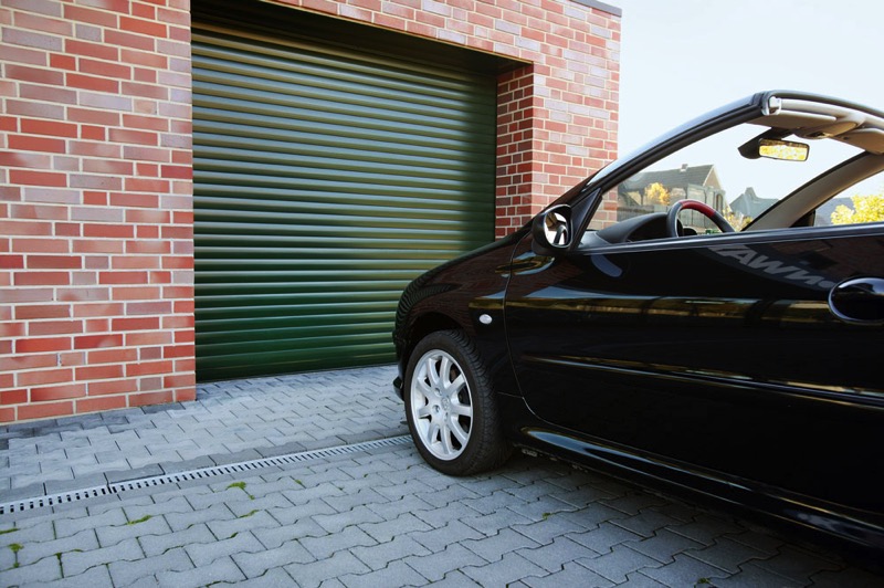 Compact roller garage door in moss green